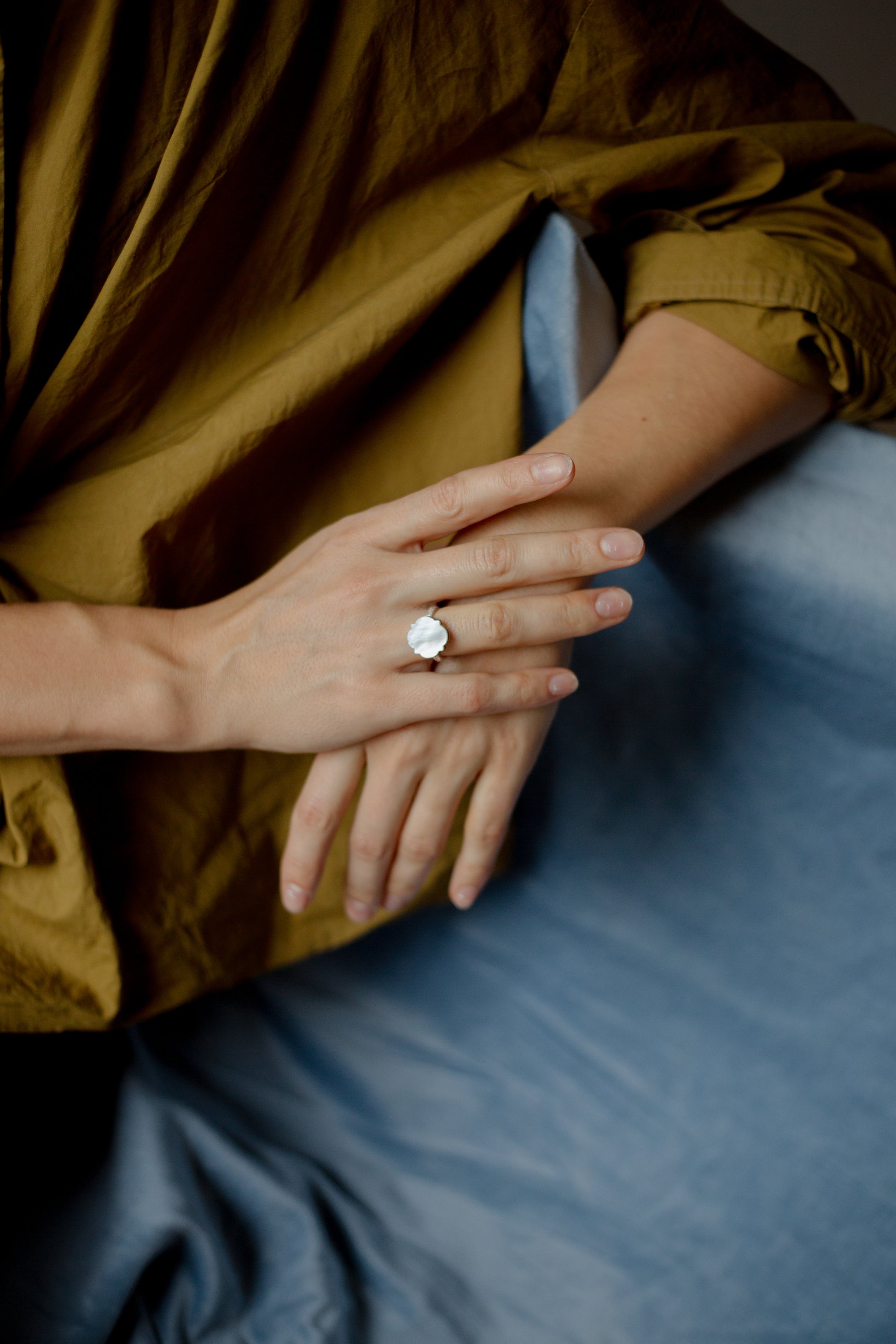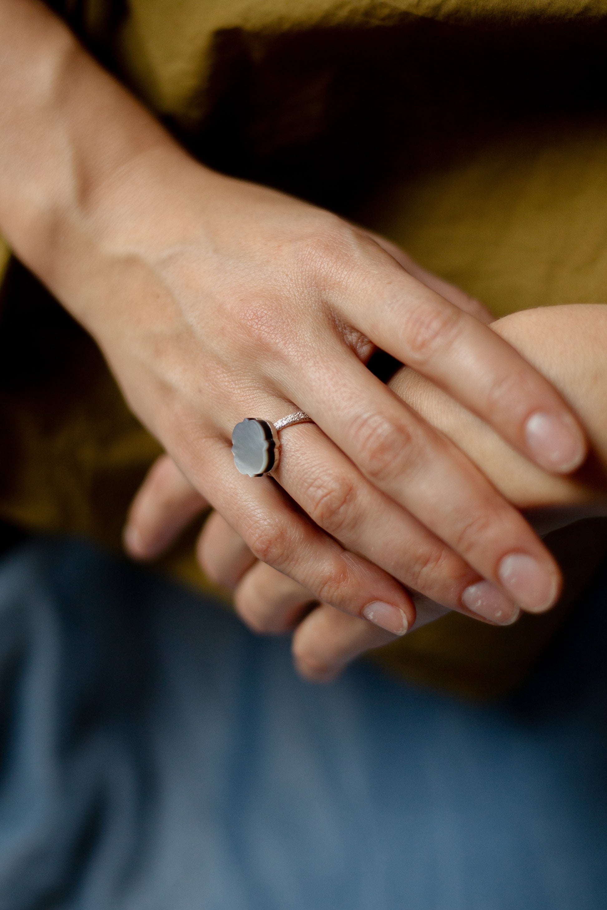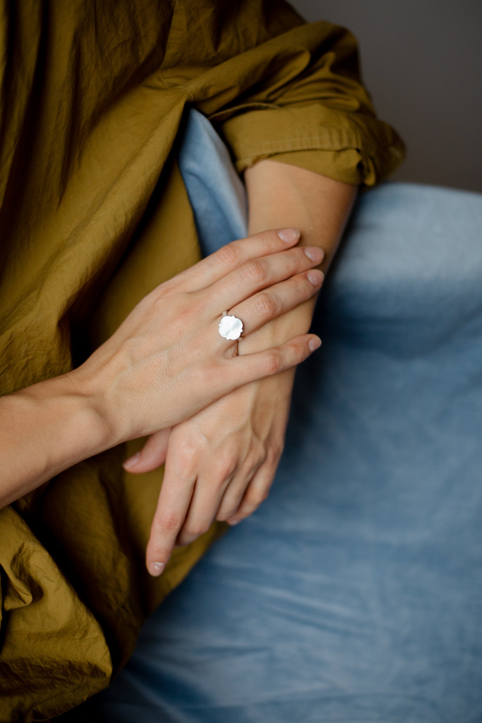 Žiedas sukurtas iš sidabro ir perlamutro kriauklės, kuri iš vienos pusės – balta, o iš kitos – tamsi, bet panašiai švytinti. Vidinė žiedo dalis palikta atvira – taip per ažūrinį raštą matytosi natūrali kriauklės spalva.